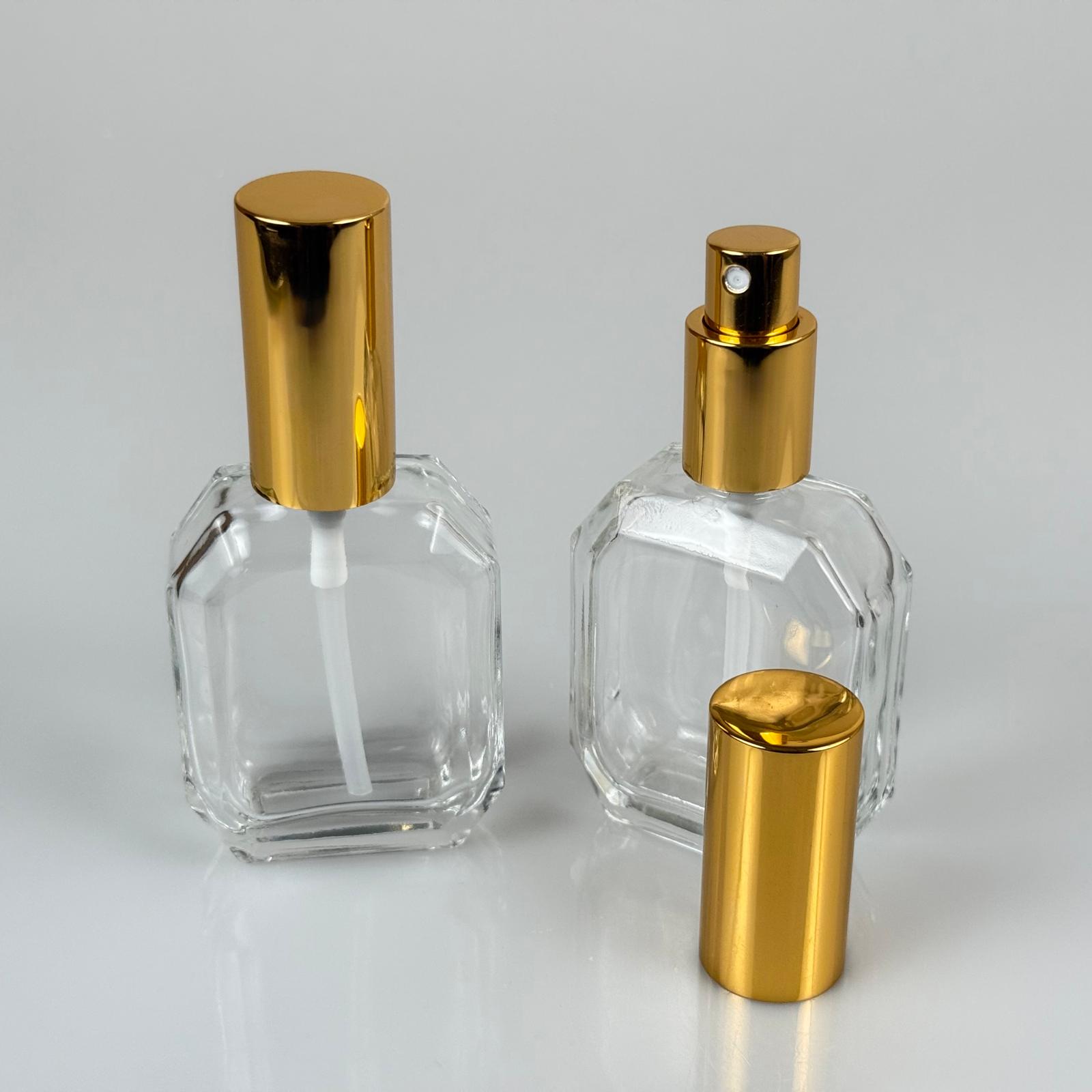 50 ML LÜKS VİDALI VALF ÇEVİRME PARFÜM ŞİŞELERİ - 50 CC ŞEFFAF CAM ŞİŞE - GOLD METAL SPREYLİ KAPAKLI SET